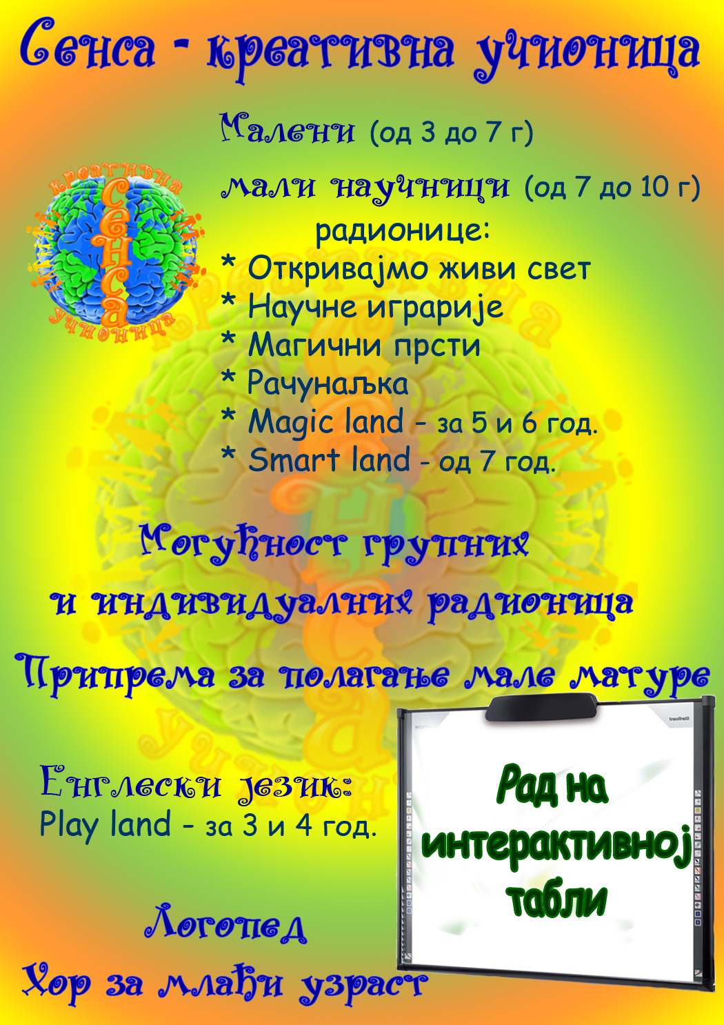 - upoznavanje zivih bica, njhovih procesa i raznovrsnosti kroz radionice, eksperimente a uz pomoc interaktivne - pametne table. (Даље)